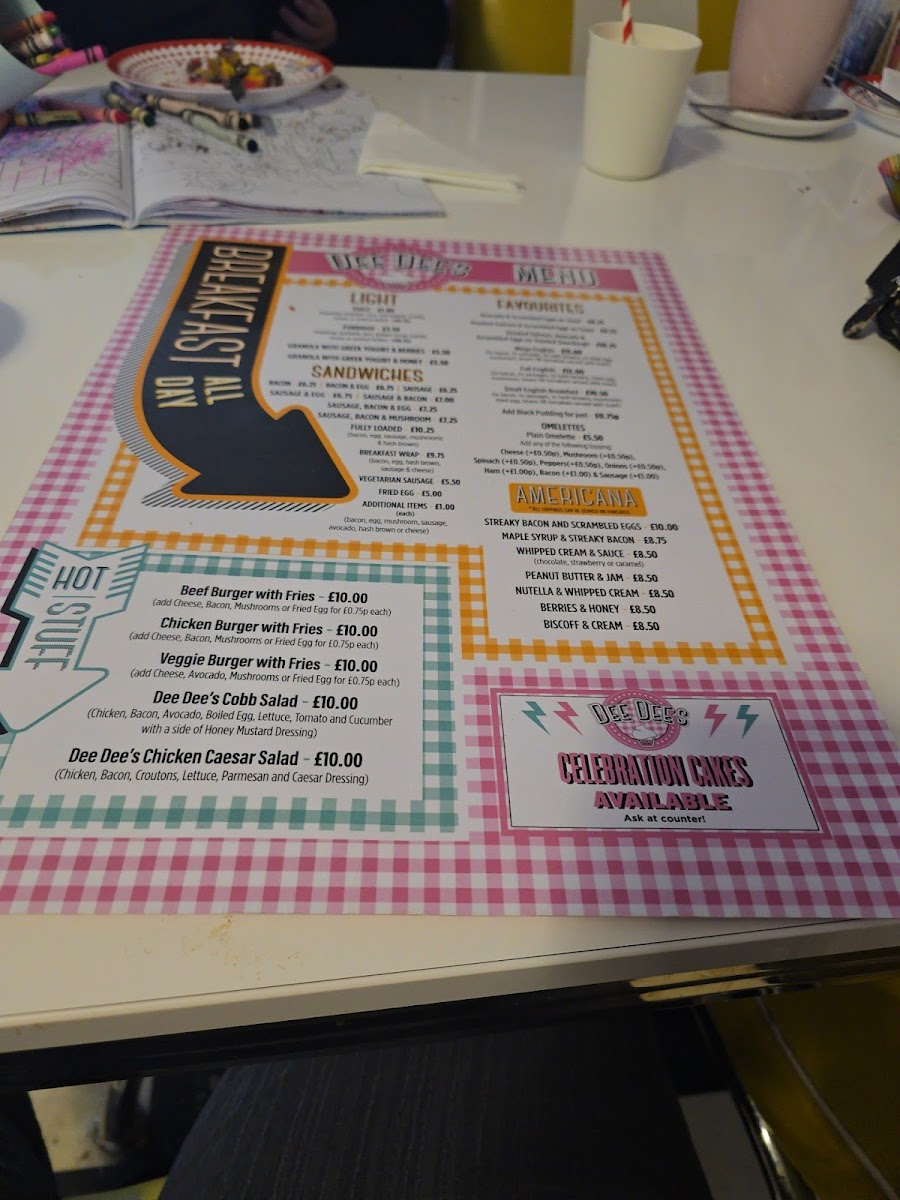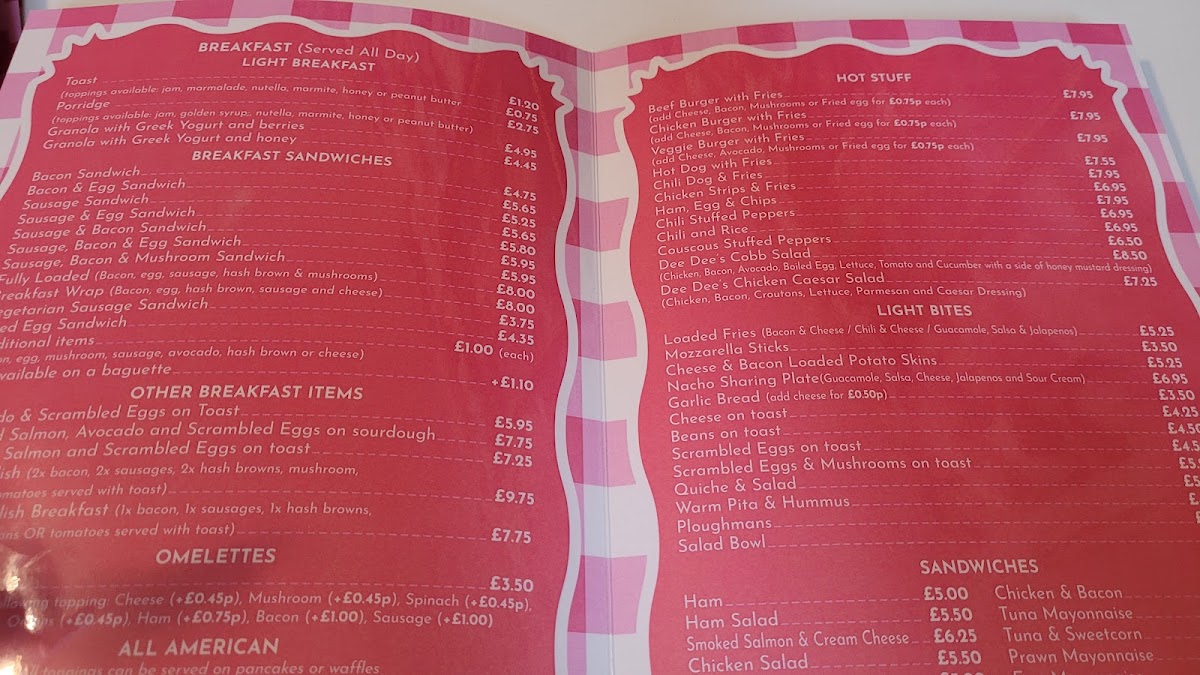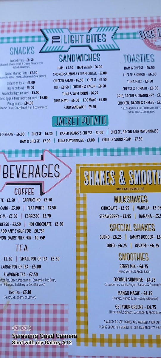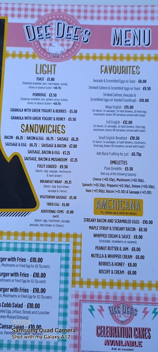 The menu at Dee Dee's offers a wide variety of dishes, catering to different tastes and preferences. For a light start, you can enjoy Toast, Porridge, or something more indulgent like Granola with Greek Yogurt & Berries or Granola with Greek Yogurt & Honey. For sandwich lovers, there are options such as Bacon, Bacon & Egg, and Sausage & Egg sandwiches. If you're in the mood for something heartier, the Beef Burger with Fries, Chicken Burger with Fries, and Veggie Burger with Fries are great choices, along with fresh salads like Dee Dee's Cobb Salad and Dee Dee's Chicken Caesar Salad. For those craving a classic breakfast, Avocado & Scrambled Eggs on Toast and Smoked Salmon & Scrambled Eggs on Toast are popular picks, with a Mega English or Full English for those looking for a more filling meal. Omelette fans can opt for a Plain Omelette, while the Americana menu features indulgent dishes like Streaky Bacon and Scrambled Eggs and Maple Syrup & Streaky Bacon. For snacks, there are Loaded Fries, Nacho Sharing Plate, and comforting favorites like Cheese on Toast and Scrambled Eggs on Toast. The Toasty selection includes Ham & Cheese, Cheese & Onion, and the ever-popular Tuna Melt. Jacket Potatoes come in various toppings, including Baked Beans, Cheese, Bacon and Mayonnaise, and Ham & Cheese. For drinks, you can choose from a selection of coffees like Latte, Cappuccino, and Americano, as well as a variety of teas, milkshakes, and special shakes like Bueno, Jammy Dodger, and Oreo. Whether you’re after a quick snack or a full meal, Dee Dee's menu offers something to suit every craving.